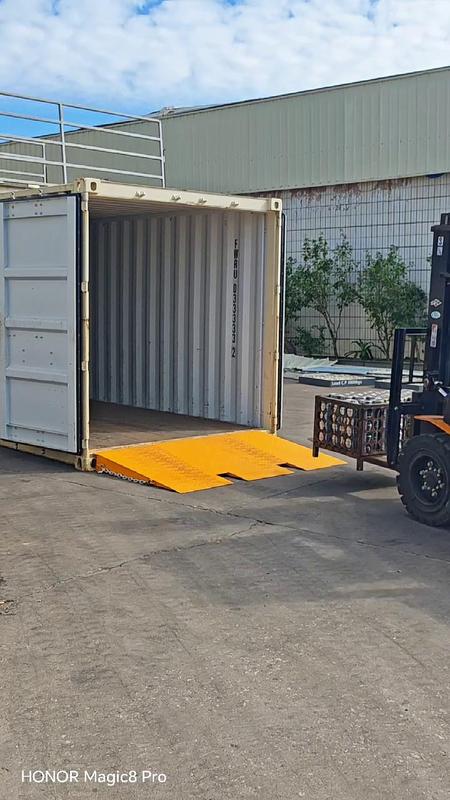 This 8-ton capacity container loading ramp(2100×1200×160mm) is a heavy-duty tool engineeredto streamline ground-level container loading andunloading. Its core function is to quickly create a secureaccess ramp, allowing forklifts to drive directly into thecontainer. The integrated forklift pockets facilitate easypositioning and movement of the ramp, while the pre- set chain anchors effectively prevent slipping duringoperation. This design ensures a safe, swift, and labor- saving process, significantly reducing loading times andoperational costs.